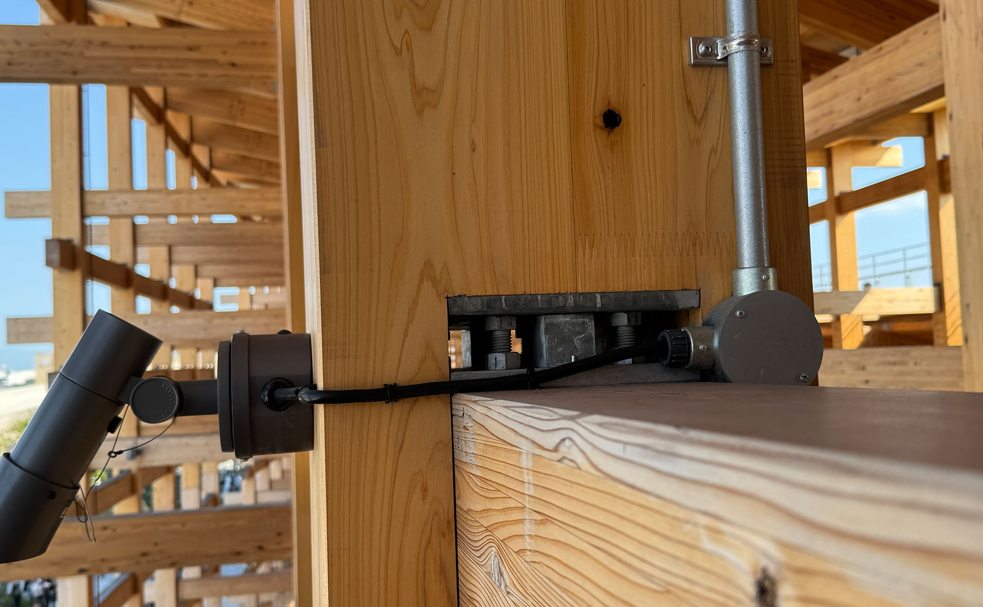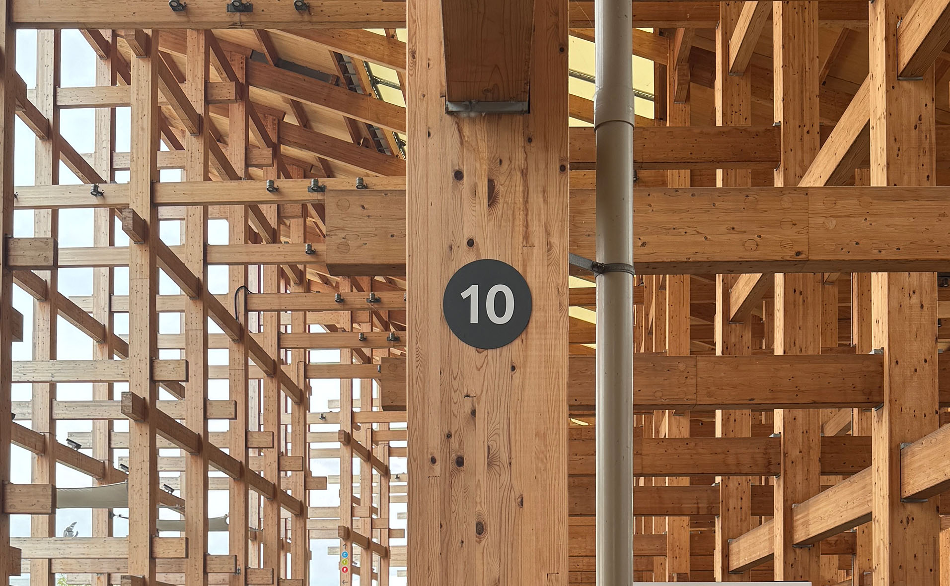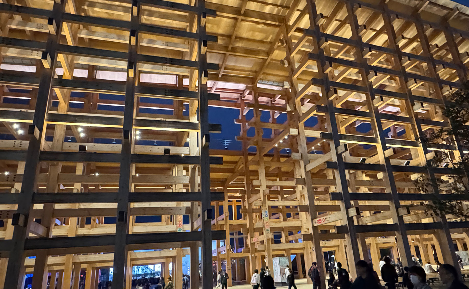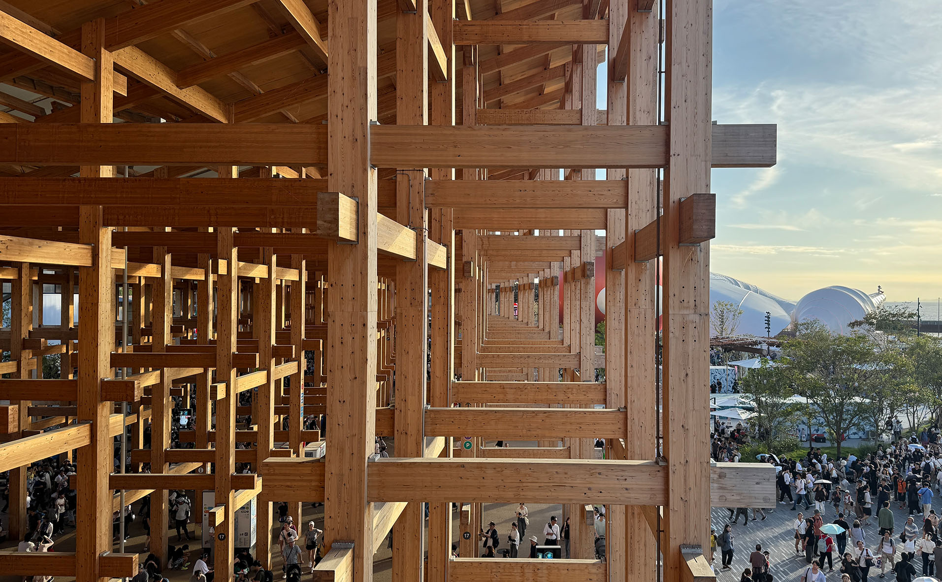 日本の神社仏閣などの建築に使用されてきた伝統的な貫(ぬき)接合に、現代の工法を加えて建築しており、大阪・関西万博会場の主動線として円滑な交通空間であると同時に、雨風、日差し等を遮る快適な滞留空間として利用されます。